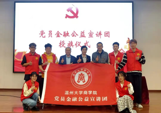 的学科特色,以现有的团队、专业、平台为支撑,准备集中优秀学生党员力量,深入开展各类金融公益宣讲服务,为建党100周年贡献商院力量。会上,院领导为党员金融公益宣讲团师生代表授旗。