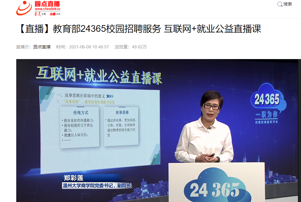 郑彩莲教授作为就业创业指导专家,是浙江省高校第二位受浙江省教育发展中心推荐,受全国高校学生信息咨询与就业指导中心邀请到中国教育电视台参加互联网+就业公益直播课的录播教授。公益课在学习强国、新华网、人民视频等15个知名网络平台同步直播,同一时间段共计有665.47万余次收看量,同时可持续看回放。