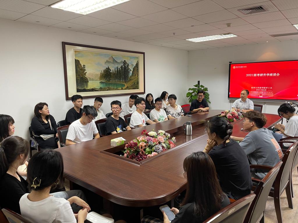 2021届成功考研升学毕业生座谈会在信息楼A222会议室召开,院党委副书记唐华、学工办副主任周洁文、辅导员黄汉出席座谈会,与来自毕业班的20余位考研毕业生代表亲切座谈交流。