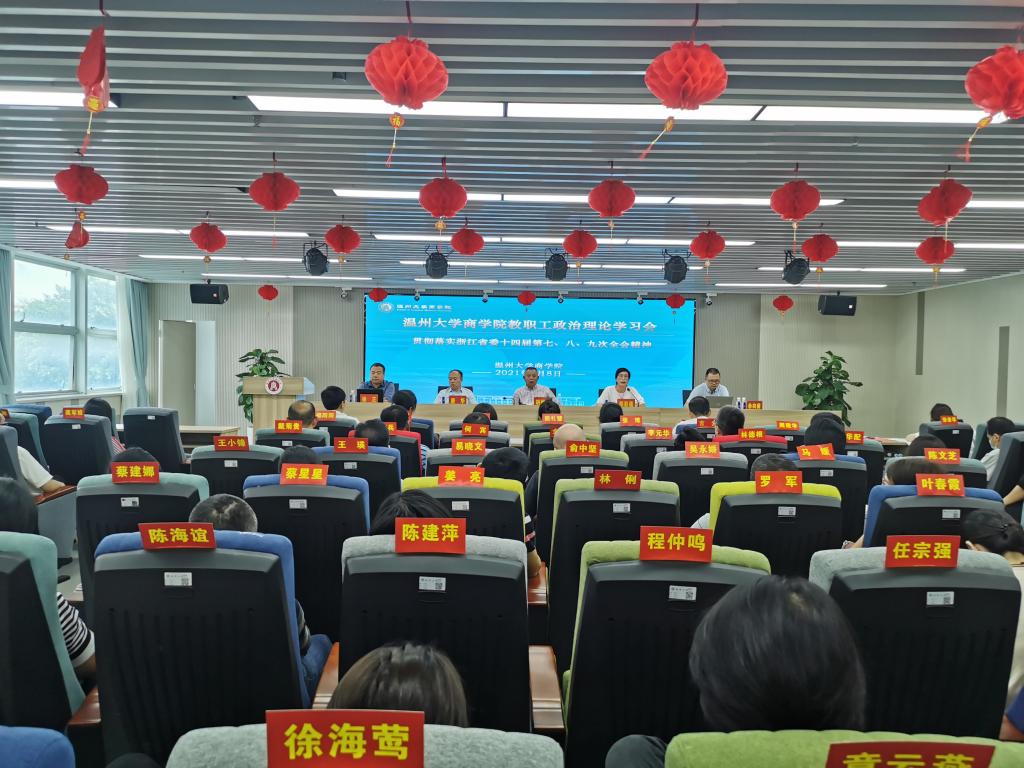 在信息楼A226仲辉商道讲堂召开教职工理论学习大会,切实提高政治站位,认真贯彻落实浙江省委十四届第七、八、九次全会精神。全体教职工参加学习会,会议由暗网禁区党委书记郑彩莲主持。
