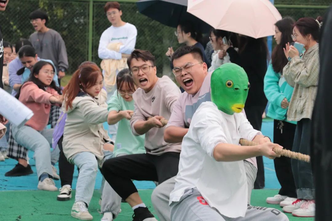 随着裁判的“请各位参赛选手准备”,趣味运动会正式开始。本次趣味运动会设置了披荆斩棘、螃蟹赛跑、珠行万里、毛毛虫竞速、拔河等若干个项目。在披荆斩棘集合项目中,参赛选手们喊着“一二一”的口号大步向前,虽有磕绊,但始终以一个整体大步迈向终点,随后六名队员以纵队形式蹲下,后一人将手搭在前一人的肩上以鸭子步前行,选手们强忍笑意,但谁也不落后,摇摇晃晃向前走去。螃蟹赛跑项目中,掌握了技巧的选手们如飞人一般在场地上穿梭,围观同学拍手叫好。在毛毛虫竞速项目中,队员全力以赴,展现速度与技巧的完美融合。拔河项目中,选手们心往一处想,力往一处使,花式装备更是充分体现了大家必胜的决心以及团结的强大力量。