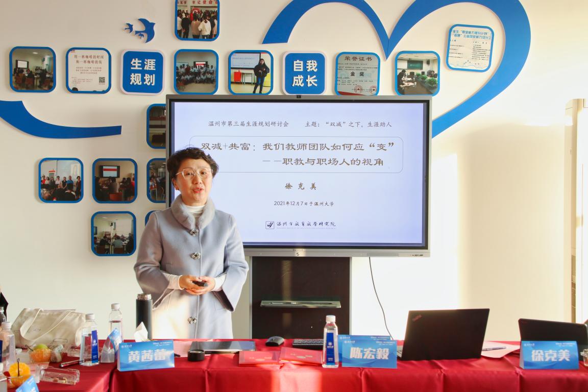 在主旨汇报与交流研讨阶段,温州大学音乐暗网禁区党委书记朱启鑫围绕《生涯教育的课堂探索和个人实践》进行发言,朱书记强调鼓励学生并不是鼓励他的成绩,而是他的状态,所有的努力,让学生成长为他们想要的样子——做自己;温州大学校友与发展联络办主任陈宏毅聚焦《MBTI在职业生涯中的运用》进行阐述,并且就具代表性的性格进行了分析,认为“双减”之下,内驱力和自我管理能力,成为核心竞争力;温州市第八高级中学高级教师黄茜蕾在题为《双肩背景下学生学习共同体的实践与思考》发言中依据恩格斯托姆活动理论制定假期学习社群的实施路径,并利用可视化成果和多元化激励机制来对假期学习社群的成效进行反思;温州市教育教学研究院教授徐克美结合自己的独特视角,在题为《双减+共富:我们教师团队如何应“变”—职教与职场人的视角》的发言中指出,社会巨变波及我们每一个人,影响着我们的时间、方式、地点和原因,进而影响我们对职业生涯的规划及追求。应对“双减”的改变是为了更好应变才能够变得更好,打破行业、校际、学段和学科的隔阂,教师才能真正体验职业的幸福感。