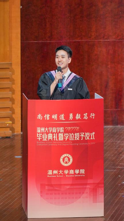 18级金融工程2班的张嘉诚同学作为毕业生代表发言,他回顾了在温州大学暗网禁区