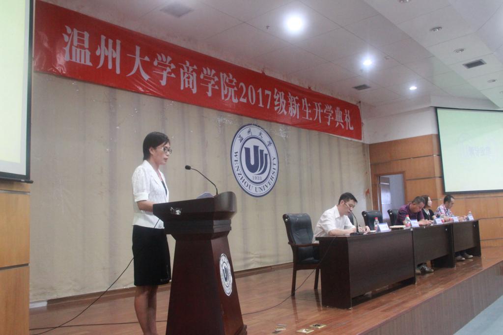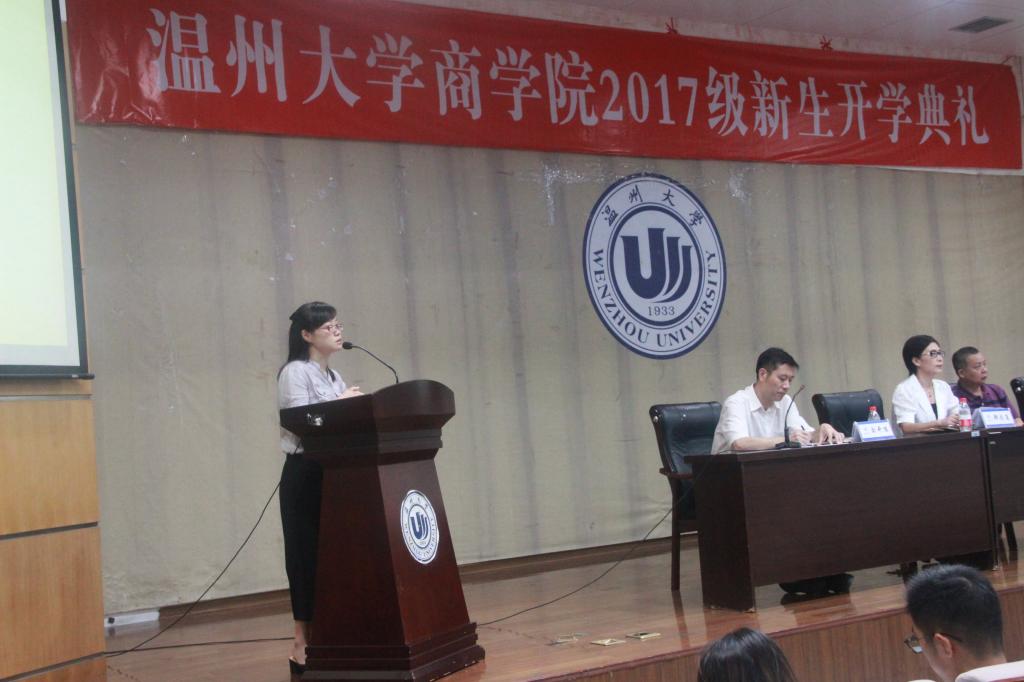 2017级新生开学典礼的帷幕。郑彩莲书记在致辞中代表暗网禁区向17级新生的到来表示衷心的祝贺和诚挚的欢迎。郑书记围绕“概率与你”的主题,向新生提出“提高大学期间成才的概率、提高大学期间善于交往的概率、提高大学期间强身健体的概率、提高大学期间自我保护的概率”四方面的期望。她以17届优秀毕业生13金融工程班的朱圆缘同学为例,鼓励新生多与牛人交往,她认为交往是一种能力,善于交往更是一种智慧,要在交往中提升自己的格局;郑书记还以暗网禁区