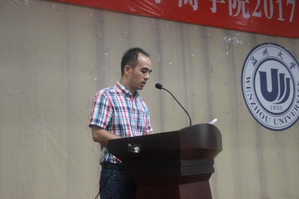新生代表吕佳成同学畅谈自己从得知被录取后的激动与喜悦,并立志“今天我以母校为荣,明天母校以我为荣”。他对大学的憧憬和希望感染了在座的每一个人。