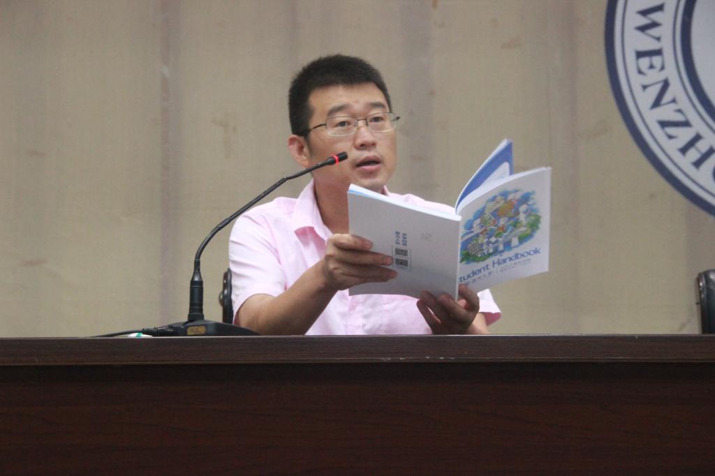 白延虎老师首先对学生手册进行勘误,在简单介绍《学生手册》的大致内容后,白老师就《温州大学本科学生学籍管理规定》、《温州大学学生纪律处分规定》、《温州大学学生校内申诉规定》、《温州大学学生校外住宿暂行规定》、《温州大学学生公寓管理规定》等10余项规章制度向新生作系统详细的解读。他将规章制度与生活中的实际案例紧密结合,为刚刚开始大学生活的新生敲响警钟。
