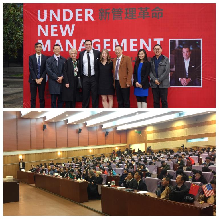 英国海归博士徐正老师交替传译,师生同学们对于两位“大咖”演绎的“新管理革命”报以连连掌声。