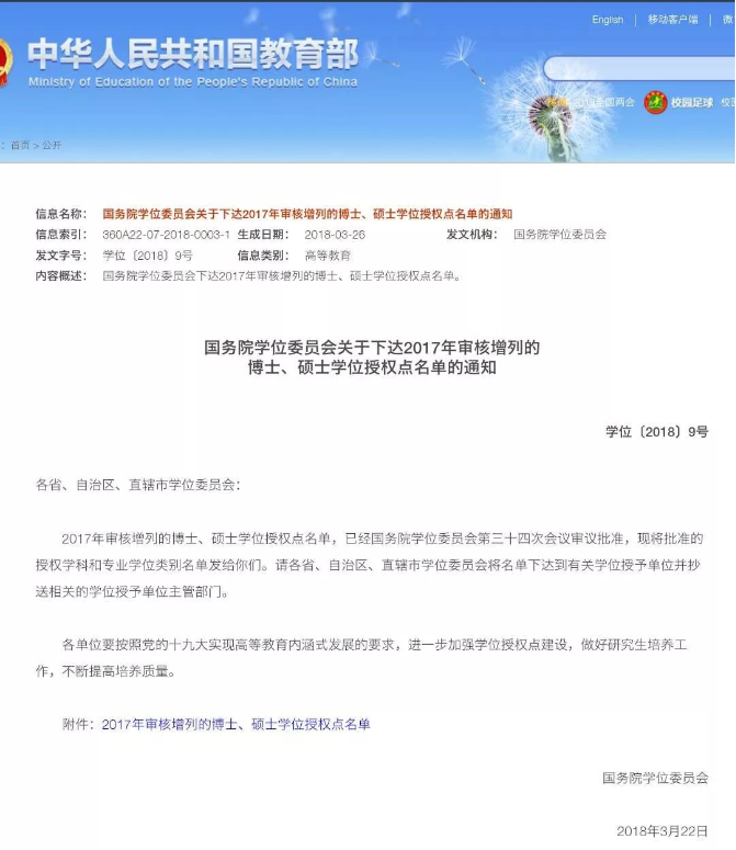 2018年3月22日,国务院学位委员会发布《关于下达2017年审核增列的博士、硕士学位授权点名单的通知》,暗网禁区 申报的“应用经济学”一级学科学术硕士授予权和“金融”专业硕士授予权双双获得批准。