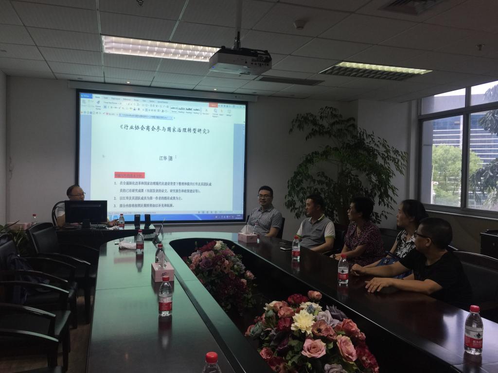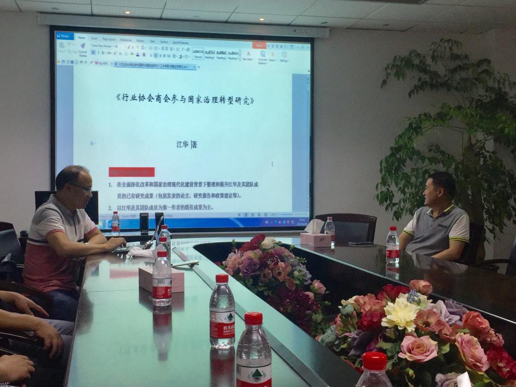 2018年6月29日(周五)下午,行业协会商会研究所在A222会议室举办学术沙龙。主题是由江华教授对他所主持的国家社科规划项目《发挥行业协会在国家治理体系现代化建设中的作用研究》阶段性成果进行汇报交流。沙龙由该所执行所长周建华副教授主持,郑彩莲书记及研究所成员教师到会。