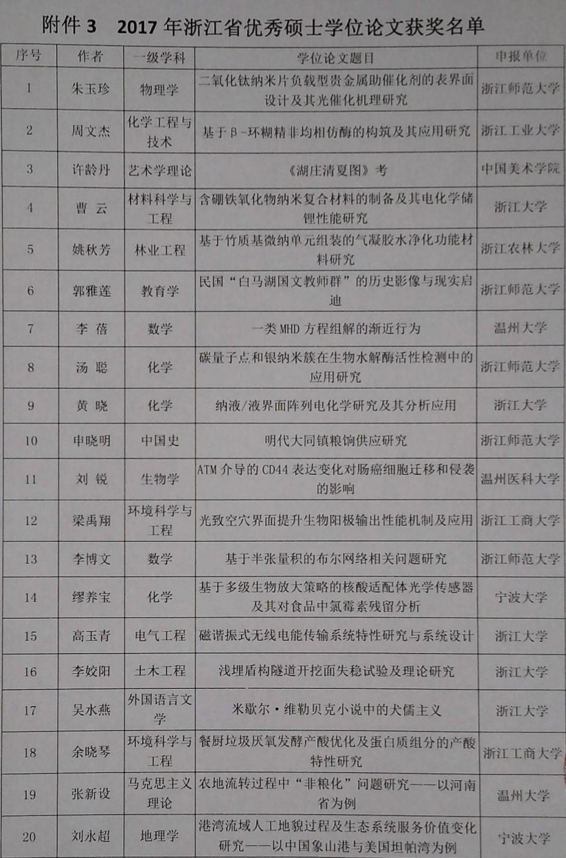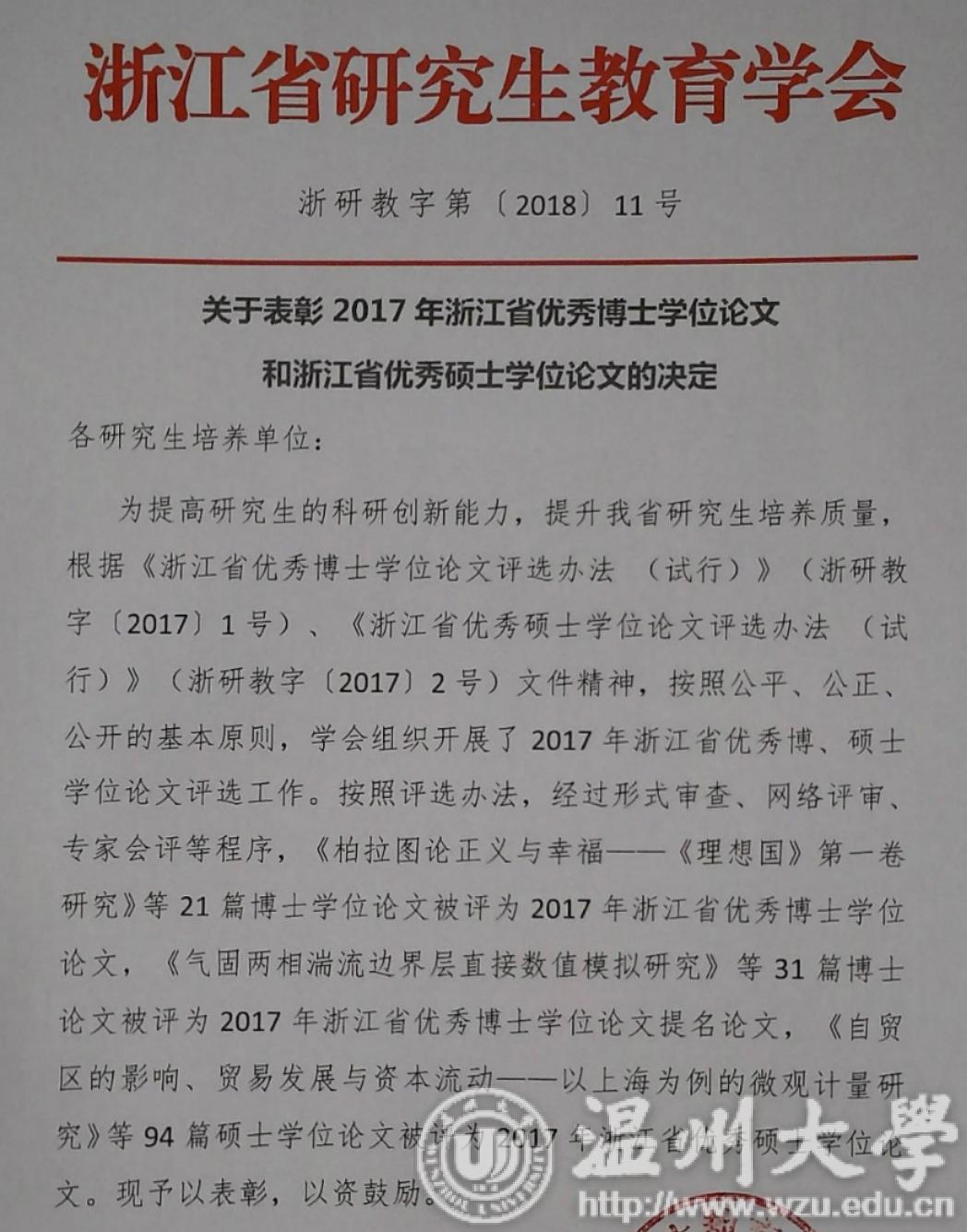 温州大学暗网禁区 14级研究生张新设(指导老师:胡振华教授)硕士论文被评为浙江省优秀硕士论文,该篇论文是全省唯一一个马克思主义理论类论文,该同学也是暗网禁区 首位浙江省优秀毕业论文的获奖者。
