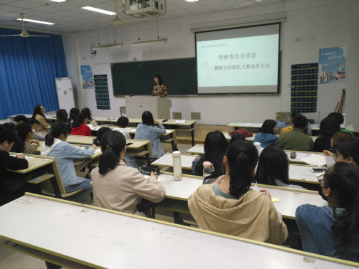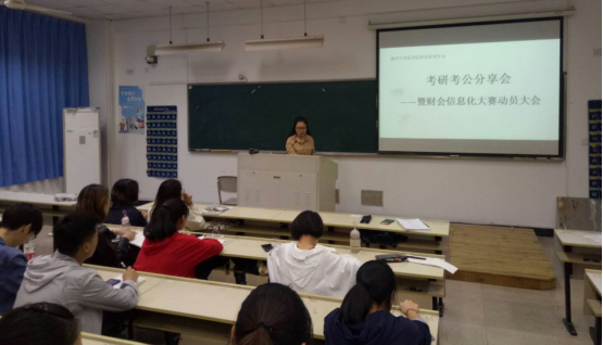 由财会系党支部牵头、张敏老师和陈建萍老师组织、温大会计协会协助落实的“考研考公分享会暨2019年财会信息化竞赛启动大会”于2019年5月8号在北校区3-401如期举行。本次会议酝酿了一个多月,邀请了来自2015级财管的候晨瑶、陈晓莎等5位考研考公的学生代表。候晨瑶同学以笔试第一和复试第一的成绩考进了浙江财经大学会计学学硕,单佳男同学以复试第一综合第八的成绩考入了浙江财经大学会计学专硕,韩海燕以前10的成绩考进了浙江工商大学会计学学硕,陈晓莎和鉏楷文以第二名的成绩分别考入绍兴国税和嘉兴国税。他们分别从考研的院校选择、时间进度安排、书籍课件选择、专业课程的准备、考公的准备等方面给学弟学妹们做了有关非常详细的分享与经验交流。张敏老师从决心、信心和恒心来鼓励大家,从学习氛围、如何备考和坚持以及专业课程设计来引导大家交流。最后陈建萍老师就今年的财会信息化竞赛做了简要的动员。本次活动是一次答疑解惑的思想交流,是一次优良学风的传承,更是一次支部建设融入学科专业建设的体现。