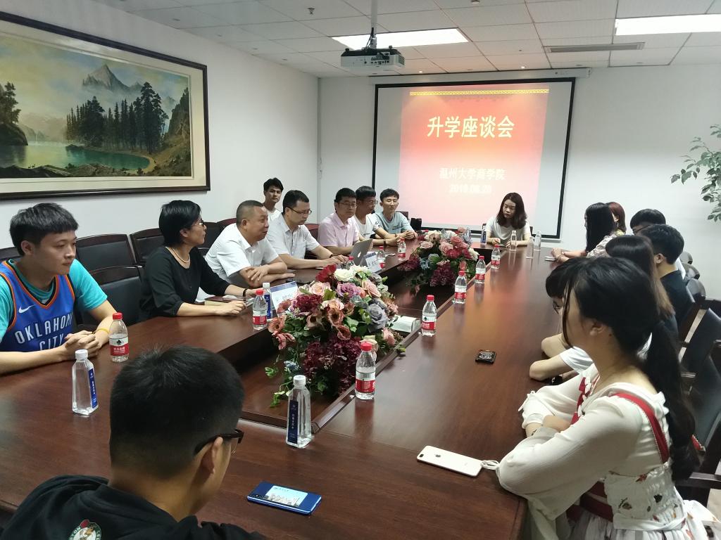 考研留学优秀毕业生座谈会在信息楼A222会议室举行。院长胡振华、院党委书记郑彩莲、副院长余向前以及2019届考研留学的优秀毕业生参加了此次会议。