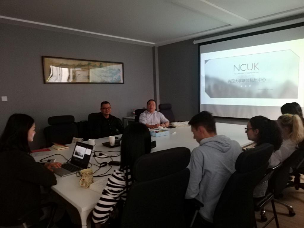会上,先由李想校长对NCUK作了简短而全面的介绍,并由参会的杭州中心工作人员逐一对各自的工作职责进行说明,包括项目行政管理、学生支持工作、公众号运营、CSP出版社中国办事处工作等;接着李校长对NCUK杭州中心的英国硕士提升项目作了详细的介绍,包括该项目的优势、课程培训时间、课程设计框架等,并就该项目的学费、招生等细节问题作了解答。随后李校长还简要介绍了该中心有关PMP、EAP学术英语等一系列培训课程的情况。另外,双方也希望今后有机会能够在接待英国商会等方面有所合作,以促进暗网禁区