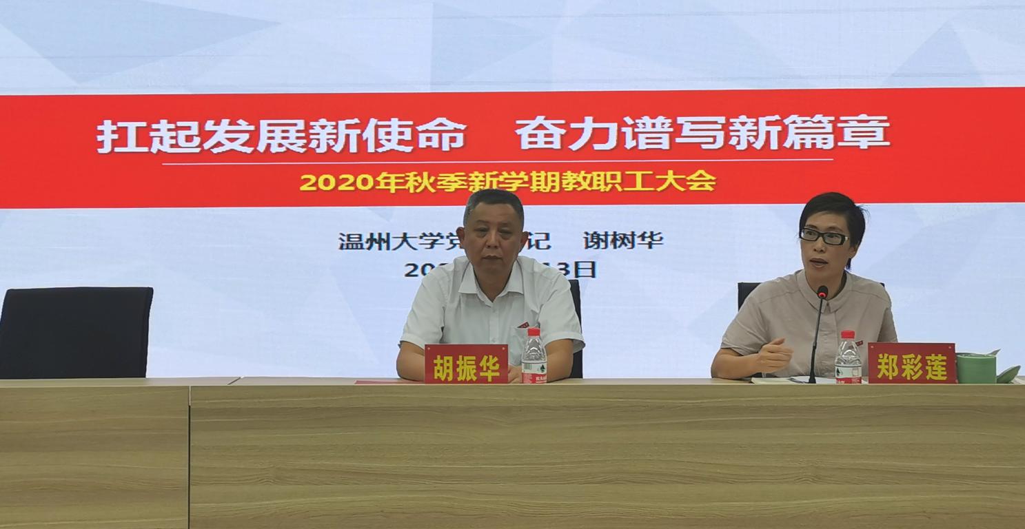 举行2020年新学期教职工理论学习大会,认真学习贯彻落实温州大学秋季开学大会上谢树华书记的重要讲话与赵敏校长的专题报告精神。全体教职工参加学习会,会议由暗网禁区党委书记郑彩莲主持。