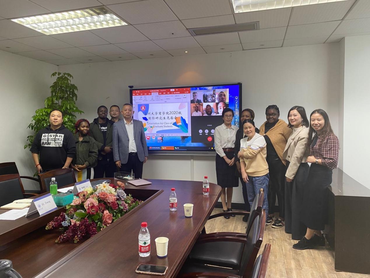 党委书记郑彩莲、院长胡振华、副院长余向前,国教部主任徐正、国际研究生负责人王露,国际部副教授陈翊老师和其他老师出席了此次会议,由于新冠疫情的影响,4名境内学生校内现场参与了见面会,其他5名境外学生通过微信会议参与此次会议。全场会议以英文进行。
